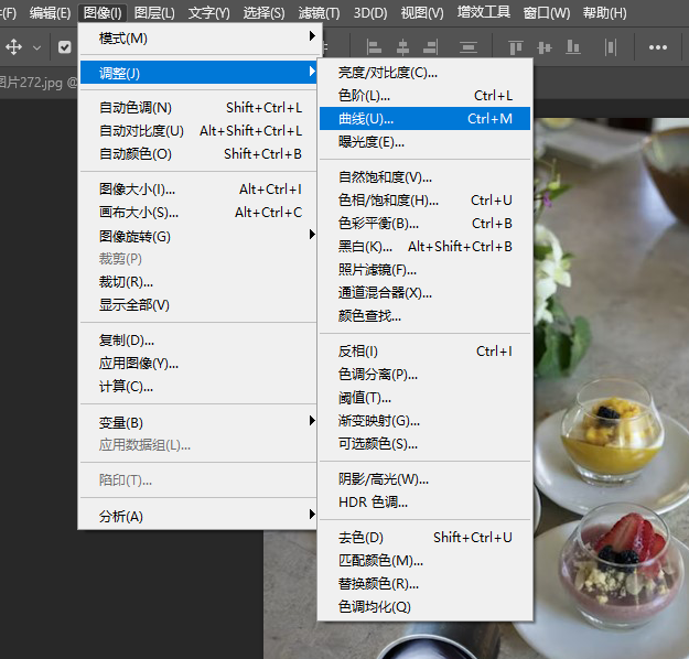 如图12所示,选中抠图所在的图层后,依次点击ps的图像-调整-曲线功能。